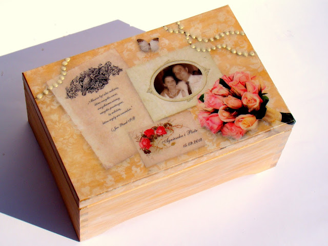 Drugi kufer ślubny w zupełnie innej kolorystce, miał być jasny. Bejcowany mieszanką bejc i pobielony. Na wieku mój ulubiony koronkowy szablon. Wyszedł trochę ptaszkowy, jakoś ostatnio ten motyw chodzi za mną :) Na wieczku zdjecie młodej pary. Ozdobiony perełkami 3D z pasty strukturalnej i zalane werniksem szklącym.